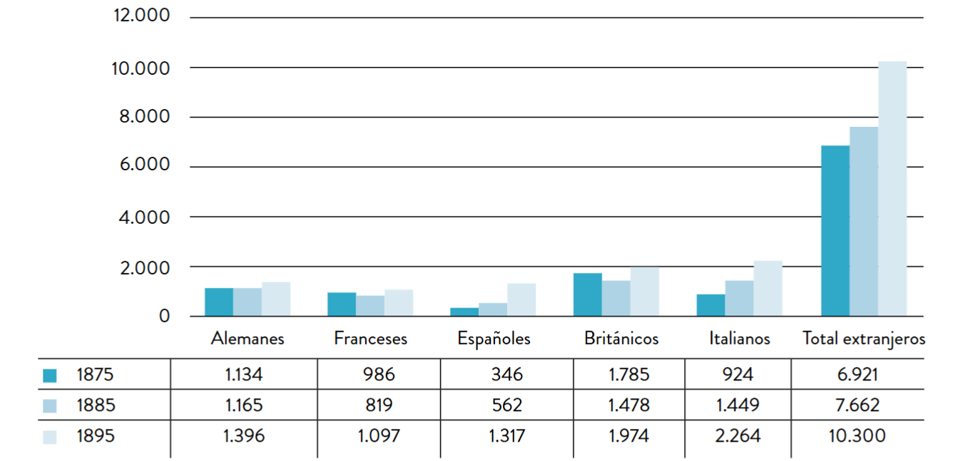 Según los datos que arrojan los Censos de la República de Chile, se observa que el número de extranjeros aumentó con el tiempo (ver tabla 1), siendo la de los británicos la colonia europea más numerosa en los censos de 1875 y 1885, con 1.785 y 1.478 habitantes, respectivamente. Recién en 1895, quedaron en segundo lugar, con 1.974 habitantes, frente a los 2.264 italianos (Censos, 1875, 1885, 1895). Valparaíso se convirtió en una ciudad muy interesante para los foráneos. Si bien, desde un punto de vista cuantitativo, no fueron numerosos los extranjeros que llegaron del Viejo Continente —solo 6,8% en 1875, 6,6% en 1885 y 7,4% en 1895—, desde el punto de vista cualitativo, su impacto en el desarrollo cultural fue significativo. Esto convirtió a Valparaíso en la urbe que experimentó el mayor crecimiento durante la centuria decimonónica, gracias al aumento de la población, la expansión urbana y el gran desarrollo del comercio (Millar Carvacho, 2000, p. 298).
