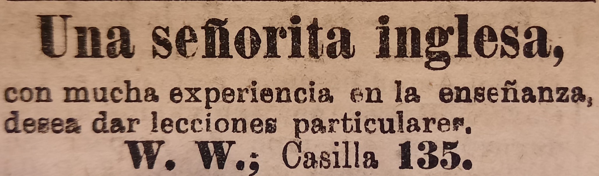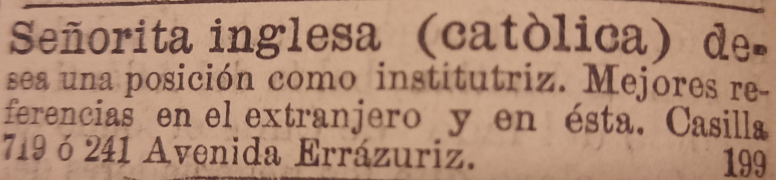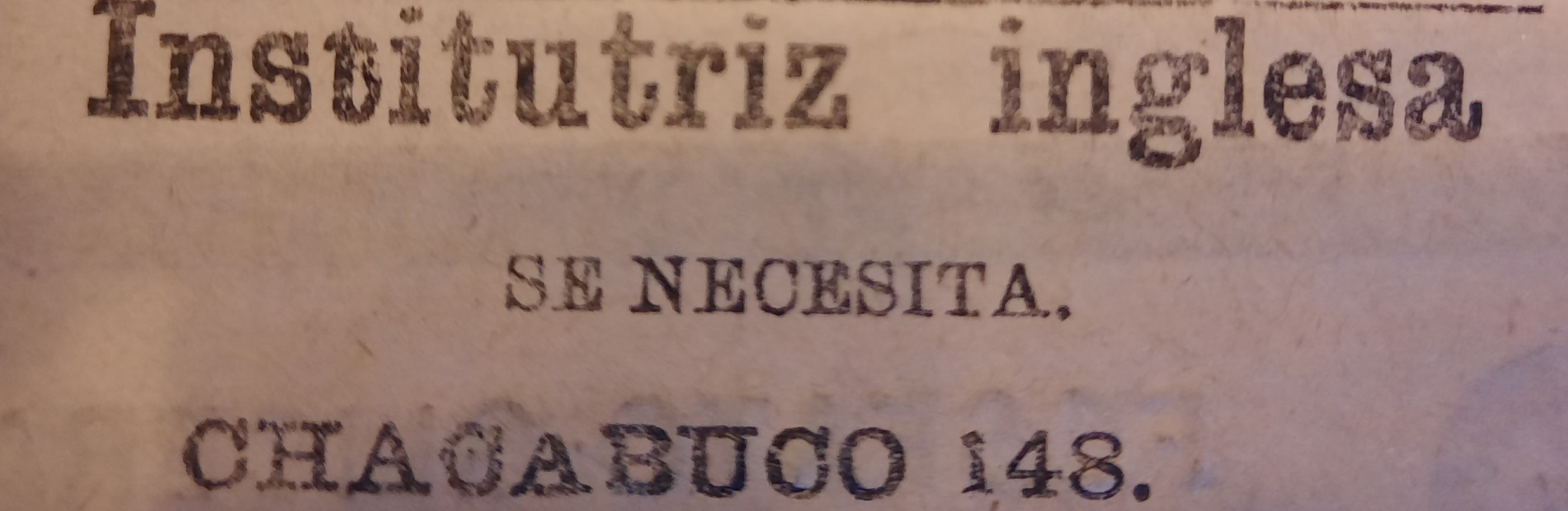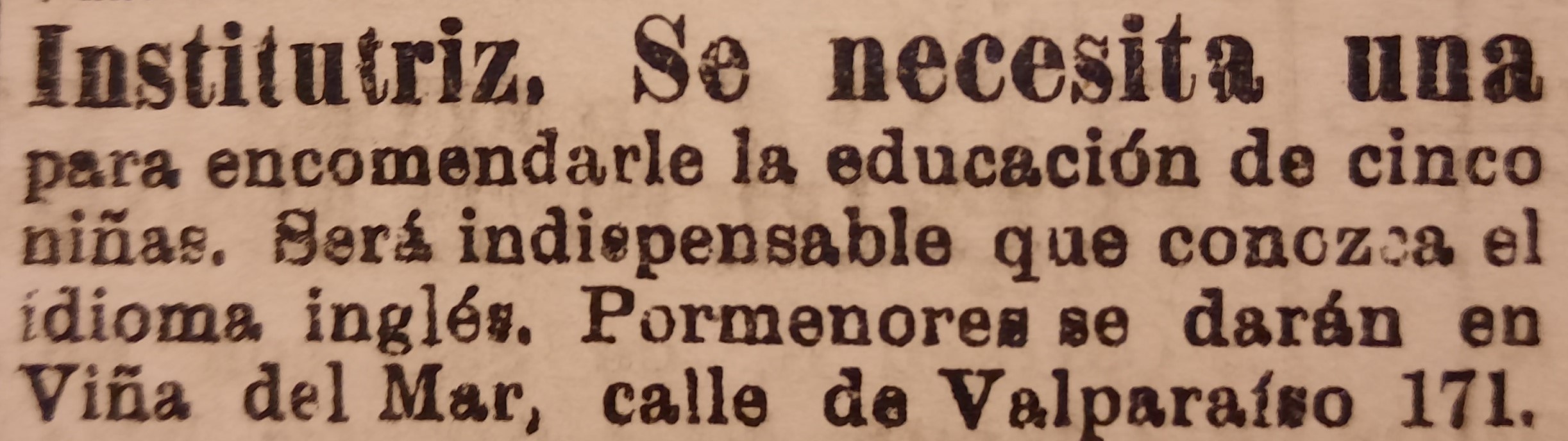 [13] “Se necesita una señora inglesa o alemana para que eduque a dos o tres niños de corta edad, que residen en una casa de campo que dista tres horas de Valparaíso por ferrocarril, y casi en la misma población, de San Felipe, provincia de Aconcagua. La institutriz debe poseer el francés o el inglés” (El Mercurio de Valparaíso, 16-21 y 23 de marzo de 1875). “Institutriz para Santiago se necesita una para la educación de un niño de 12 años. Debe saber idiomas y música” (La Unión de Valparaíso, 17, 19 y 20 de marzo de 1895). “Institutriz se necesita una que tenga buenas referencias y que pueda enseñar música e idiomas” (La Unión de Valparaíso, 16, 17, 19-21 de marzo de 1895).