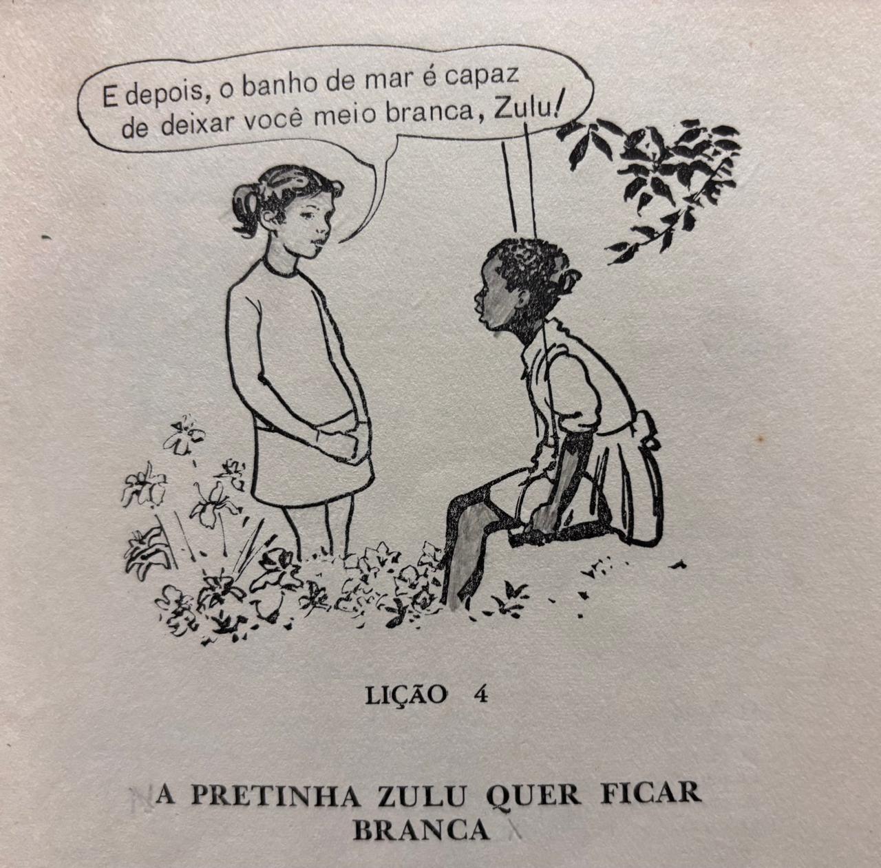 Analisando o texto acima podemos identificar graves enunciações de discriminação racial diretas e indiretas. Em primeiro lugar há uma responsabilização da criança negra por não saber ler e assim não falar “direito”, que omite a condição do escravizado, ou liberto, a quem era negado o acesso à educação. Neste caso, falar errado indica a condição da pessoa analfabeta e a responsabiliza por sua própria condição. Em segundo lugar, o texto reforça a mitologia do branqueamento como algo positivo e desejável, que corresponderia a uma via de acesso a uma condição superior de inteligência e de superioridade moral. Este aspecto é notável no trecho que associa bondade à branquitude, e negritude à maldade. O que indica a necessidade de Zulu negar e invalidar sua identidade racial condicionando sua aceitação social por sua suposta “branquitude interior”, como se sua negritude fosse um defeito a ser superado pela “bondade”[4]. Negação que também lhe traria, com o banho de mar, um aumento de sua capacidade cognitiva, traduzida em maior velocidade de aprendizagem. Além disso, há um elemento ligado à ameaça de castigo como método de aprendizagem. Não aprender significa ter negada a chance de ir à praia, e, além disso, ter de ficar com a “cozinheira preta”, cuja presença na viagem sequer é cogitada. Estes elementos são robustos o suficiente para demonstrar como o livro expressa o que intelectuais negras/os brasileiras/os denominam “racismo à brasileira”[5], que se caracteriza por não ser abertamente segregacionista, mas por operar através da idealização do branco e da branquitude promovendo a completa desqualificação do negro, ainda que o faça de uma forma velada e disfarçada como supostamente elogiosa.