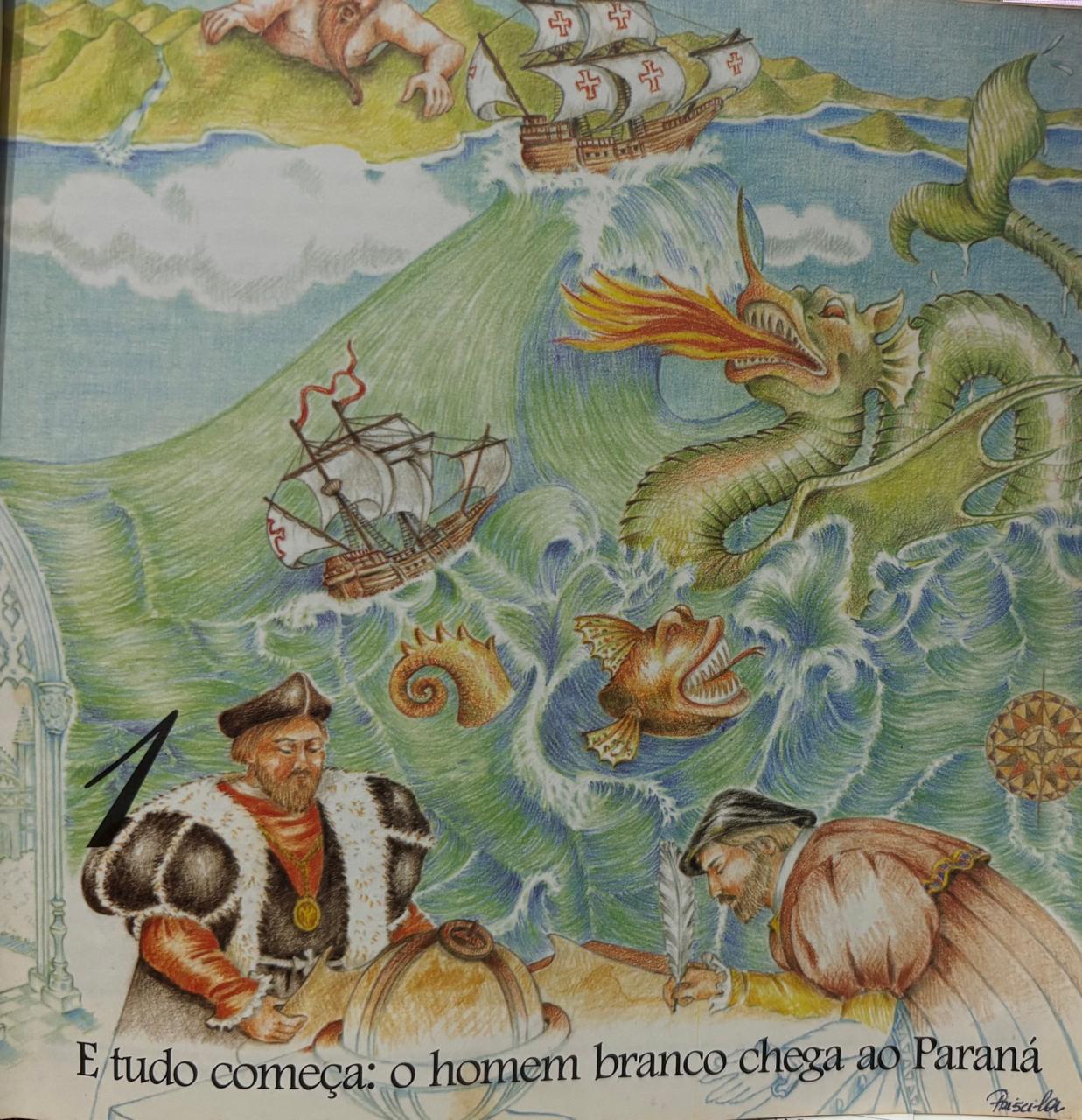 Mas talvez, sejam as ilustrações do livro que mais contribuem para a fixação deste imaginário que reproduz o cânone europeu da formação paranaense. Vejamos a seguir duas delas. A primeira é a ilustração que abre o primeiro capítulo do livro, cujo título “E tudo começa: o homem branco chega ao Paraná” induz claramente à ideia de um território vazio e sem história, enquanto a imagem retrata a luta entre o imaginário fantástico e a racionalidade científica que anima os navegadores e descobridores europeus.